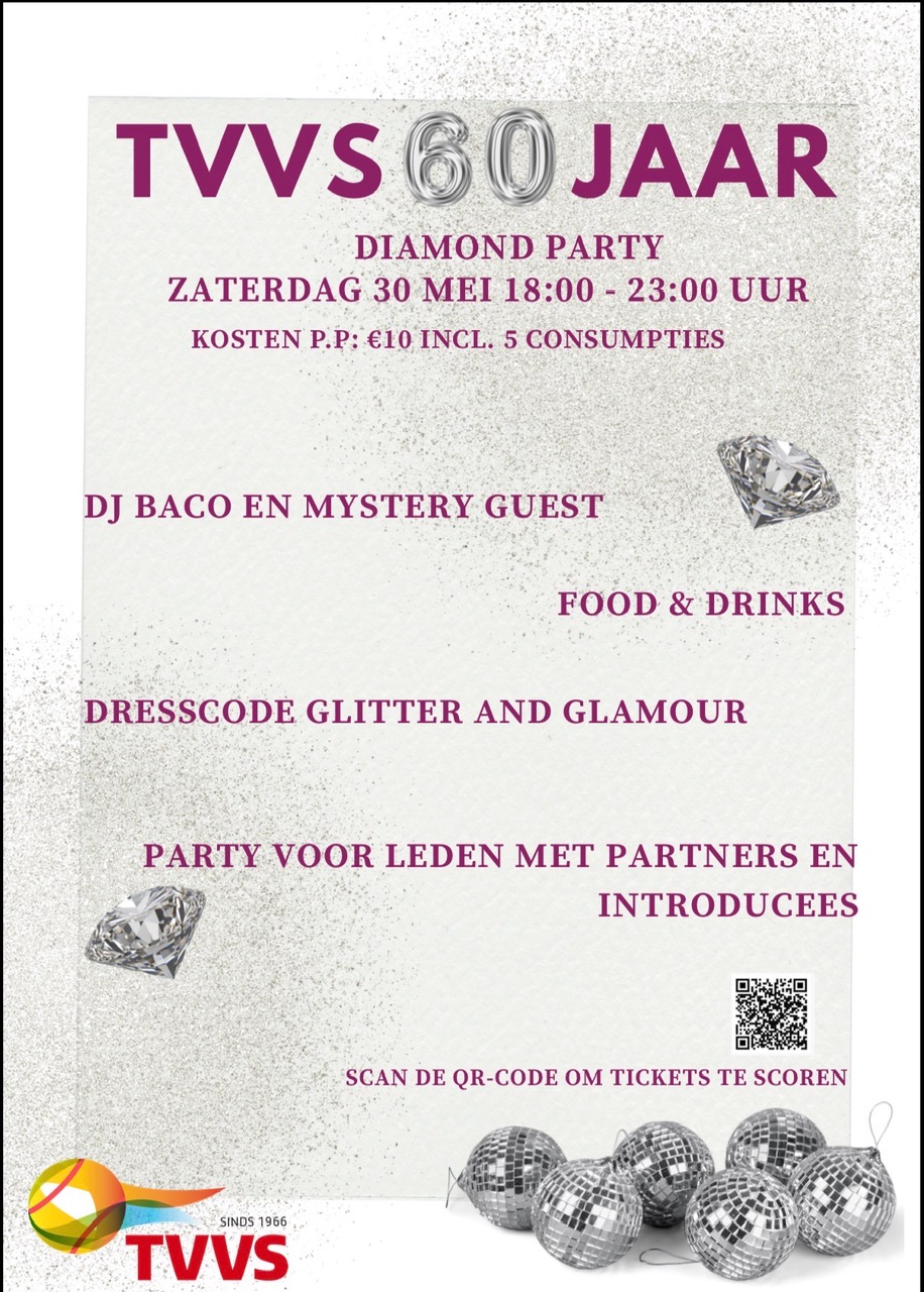Dit wordt dΓ© avond om samen herinneringen op te halen, te dansen, te lachen en te proosten op 60 jaar TVVS. Zorg dat je erbij bent, want dit feest wil je niet missen!